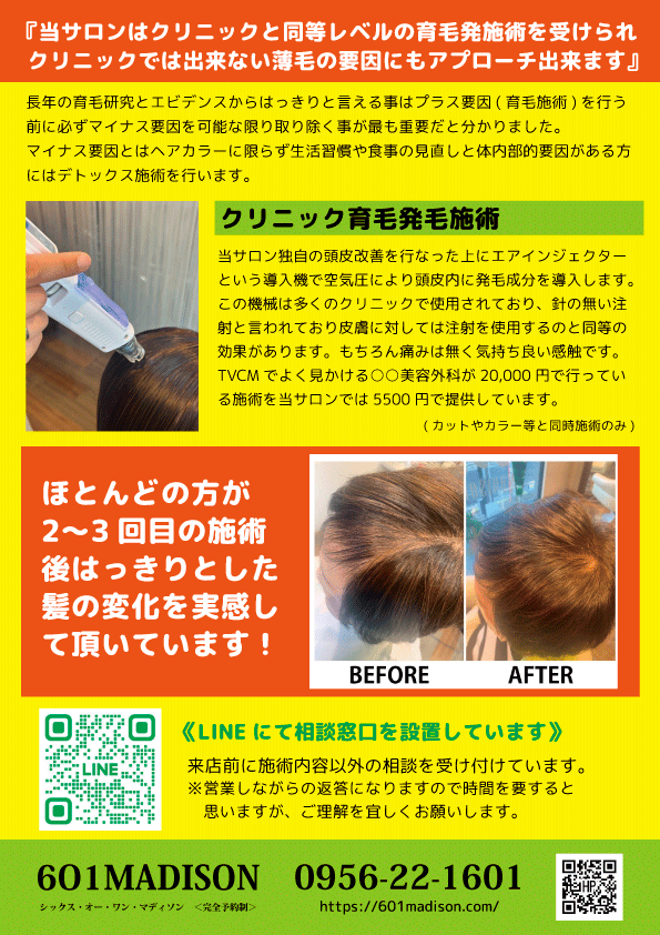 長年の育毛研究とエビデンスからはっきりと言える事はプラス要因(育毛施術)を行う前に必ずマイナス要因を可能な限り取り除く事が最も重要だと分かりました。